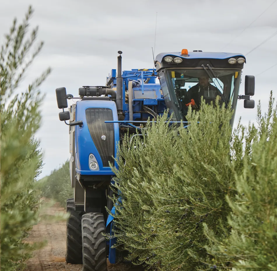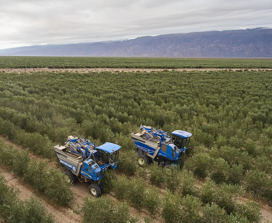 Contamos con la única cosechadora New Holland Braud 9090X Olive en funcionamiento en Argentina, diseñada específicamente para olivares en súper alta densidad.